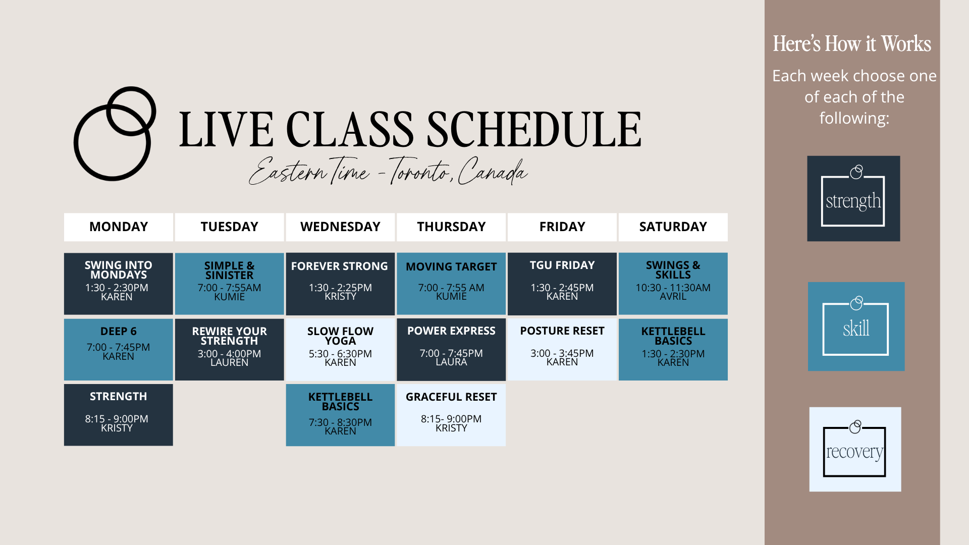 Each week: 1 strength class, 1 skills class
